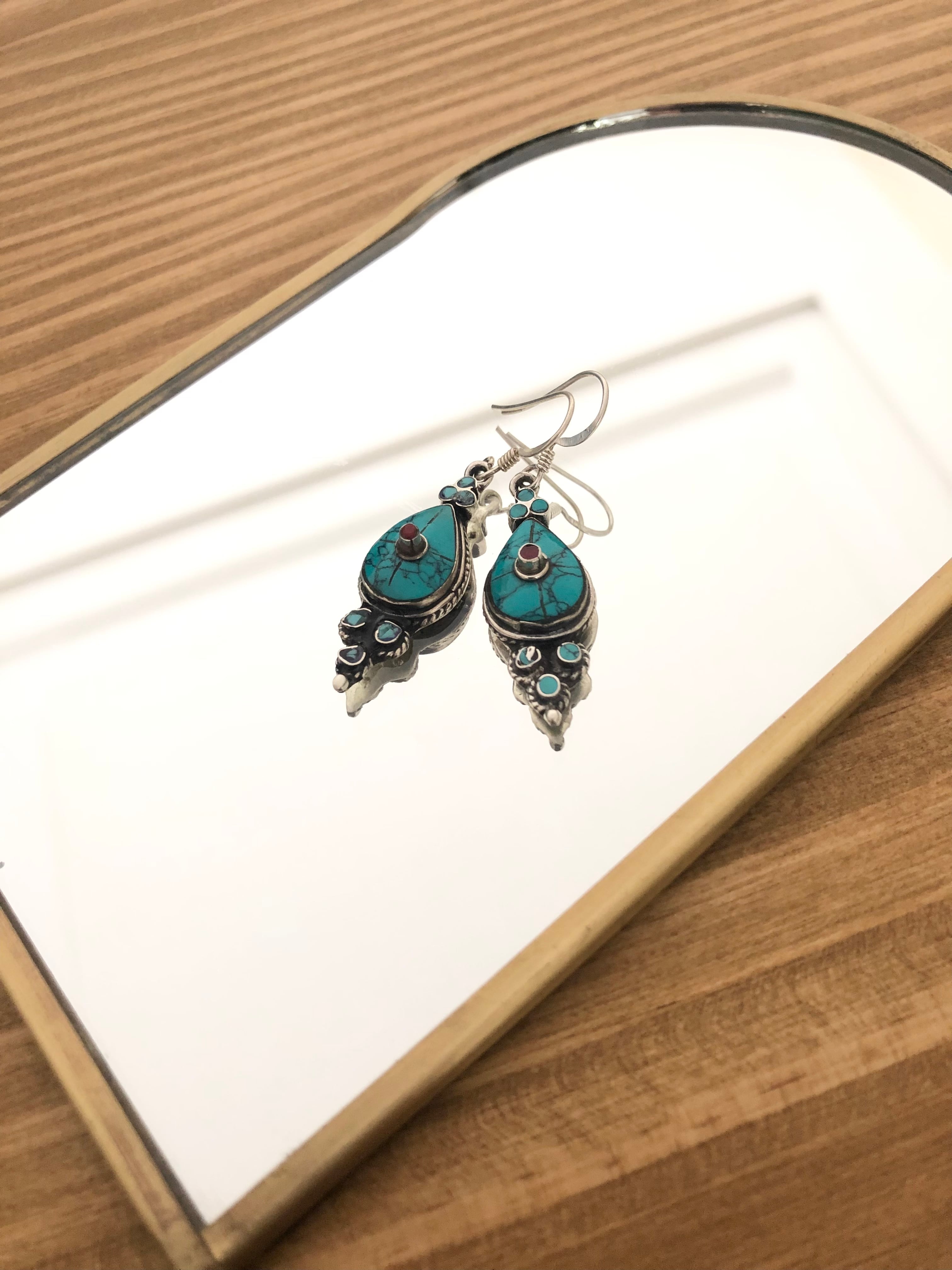 鮮やかな水色が美しいトルコ石を雫型に使用したオリエンタルなデザインのピアスです。大き過ぎず適度なボリュームで、カジュアルにもエレガントにも着けていただける一品です。