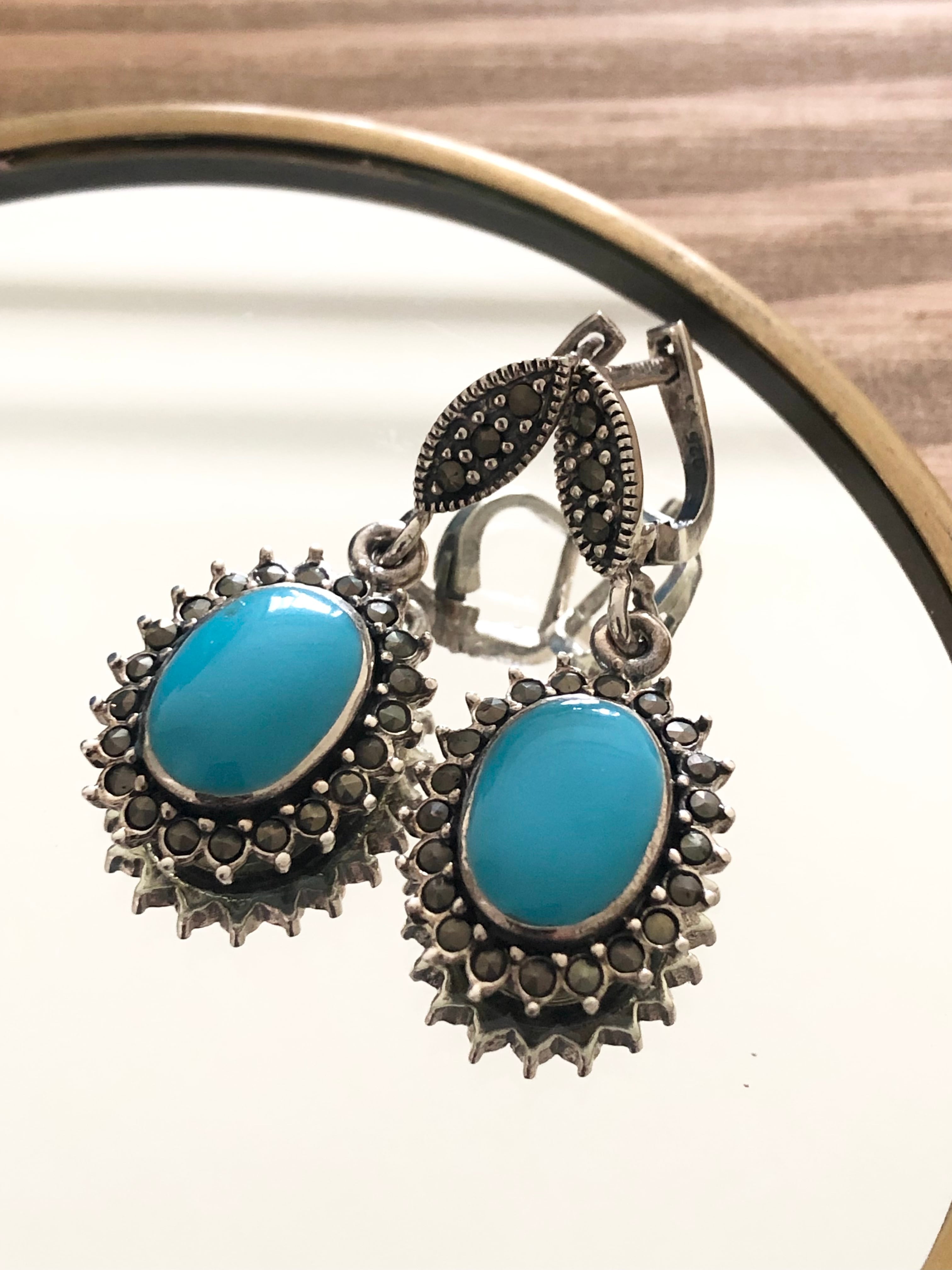 お花のようなトルコ石を中心としたデザイン。ピアス金具と石を囲むようにブラックの石が敷き詰められキラキラします。揺れて可愛い大ぶりのピアスです。