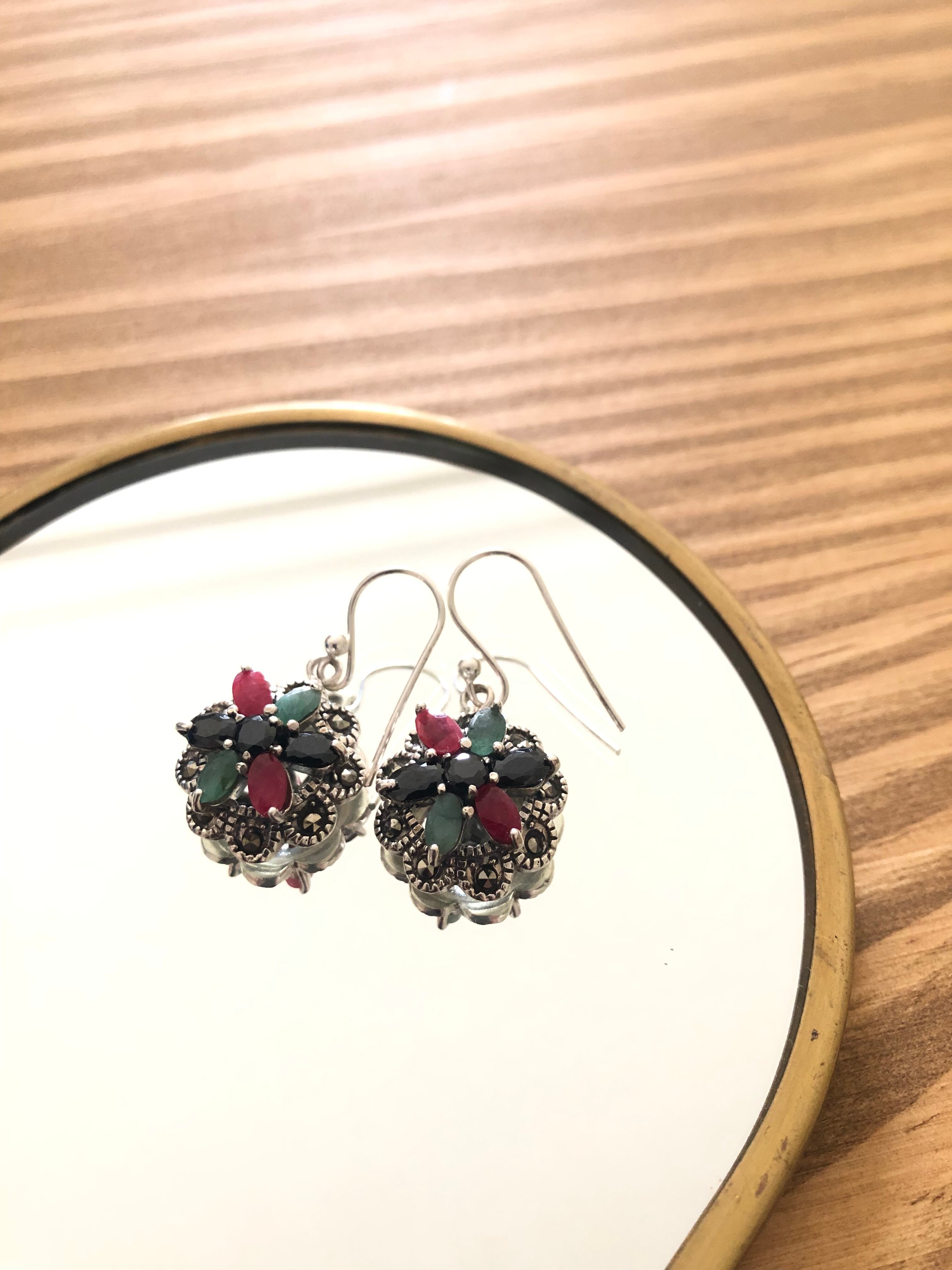 カラフルな天然石がお花のように使われている華やかなシルバーピアスです。