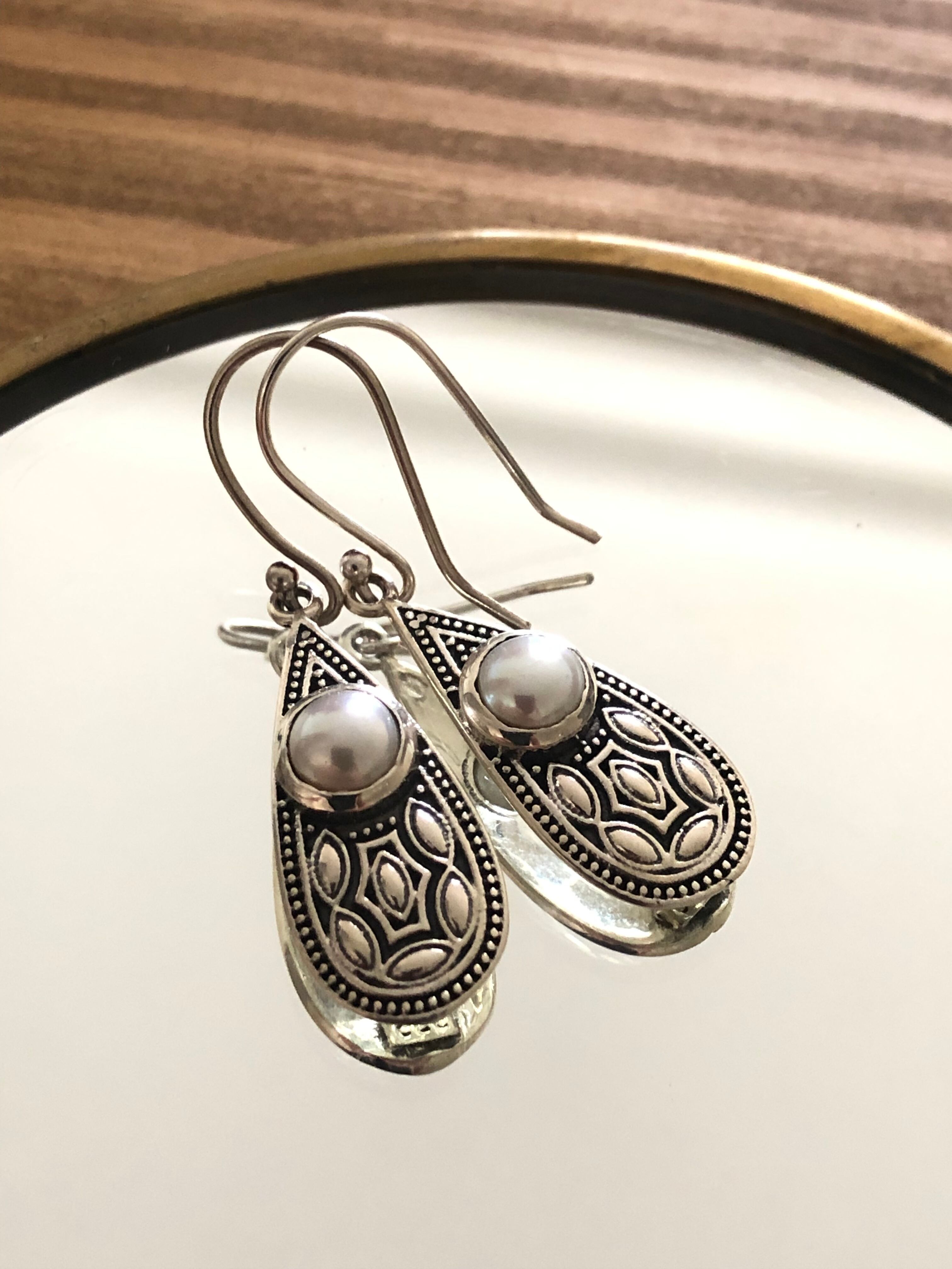 パールをセンターに、大きなドロップのシルバーピアス。カジュアルにもエレガントな装いにも合わせられます。
