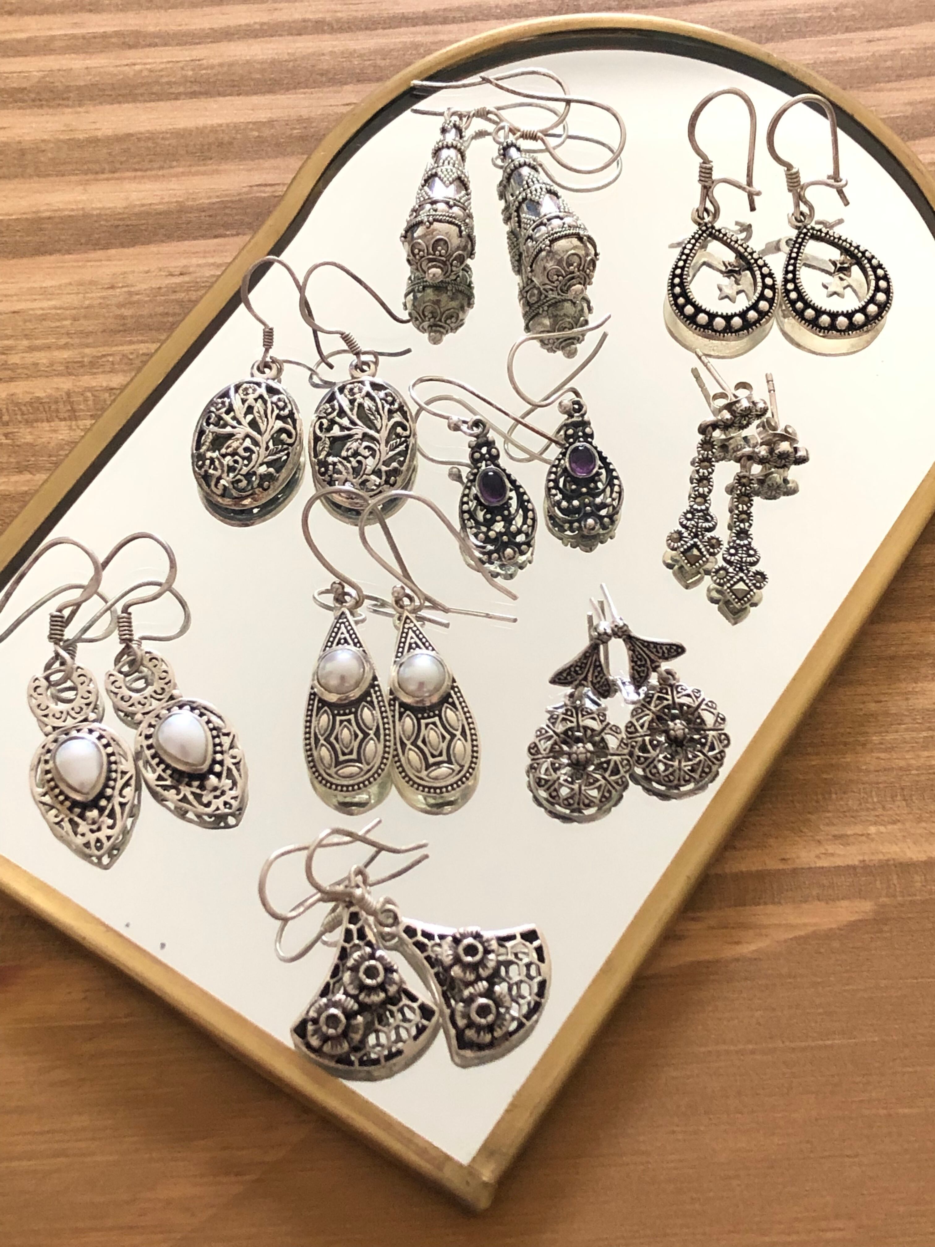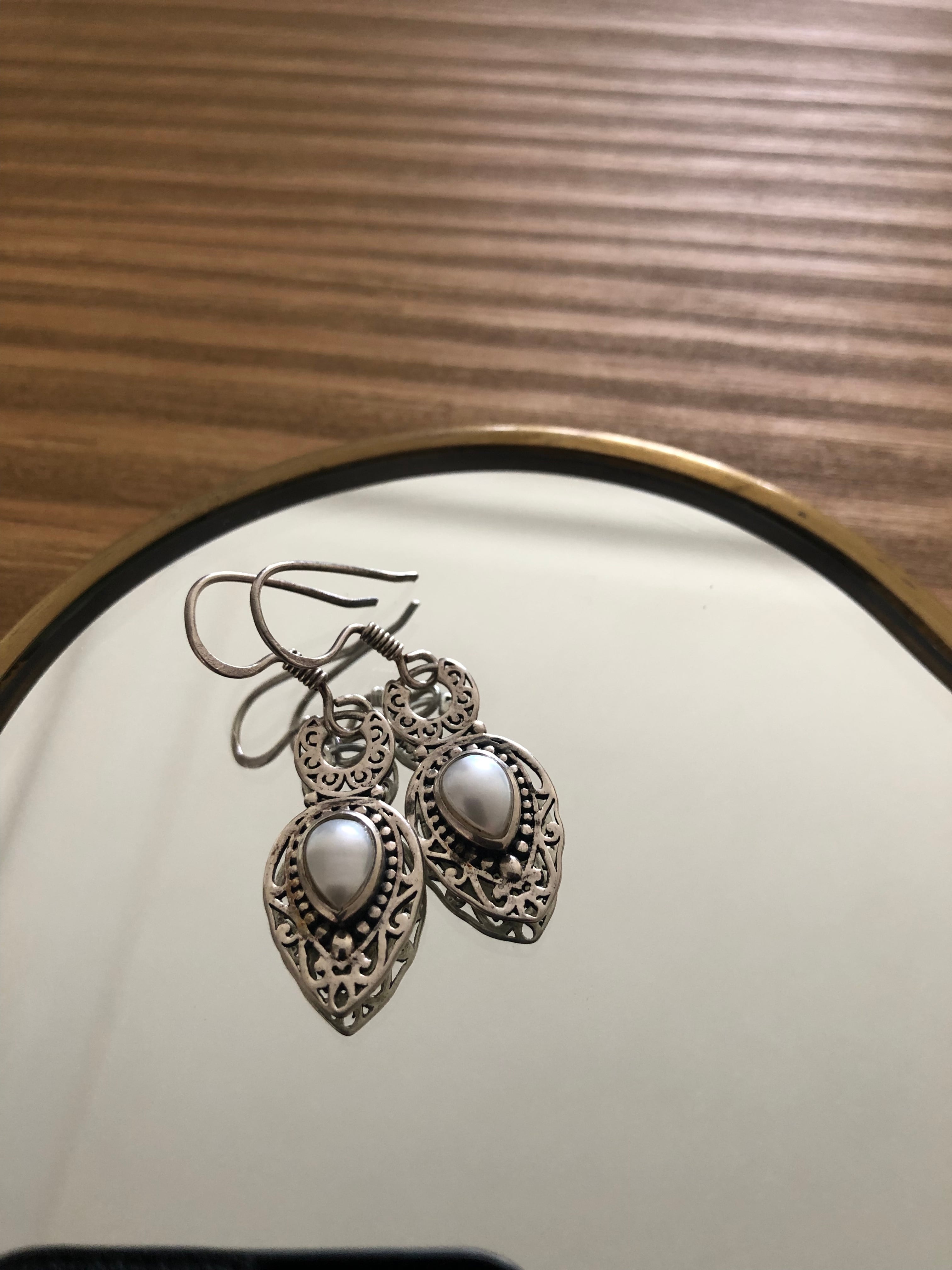 まさにアラビックなデザイン!のパールをセンターにした変わりドロップのシルバーピアスです。