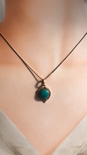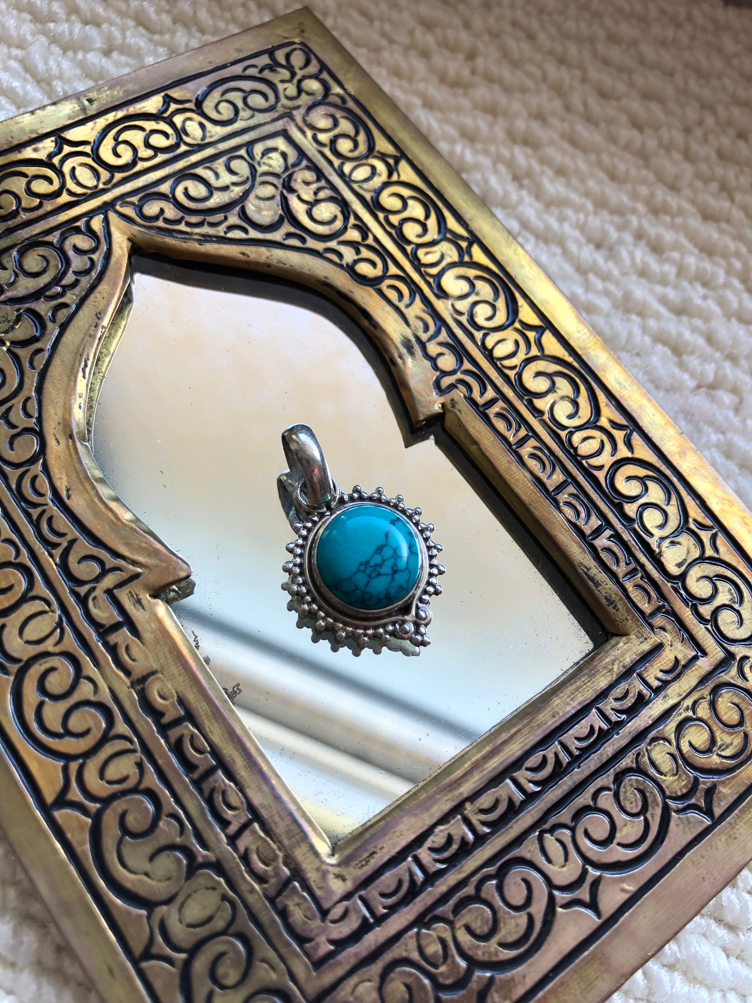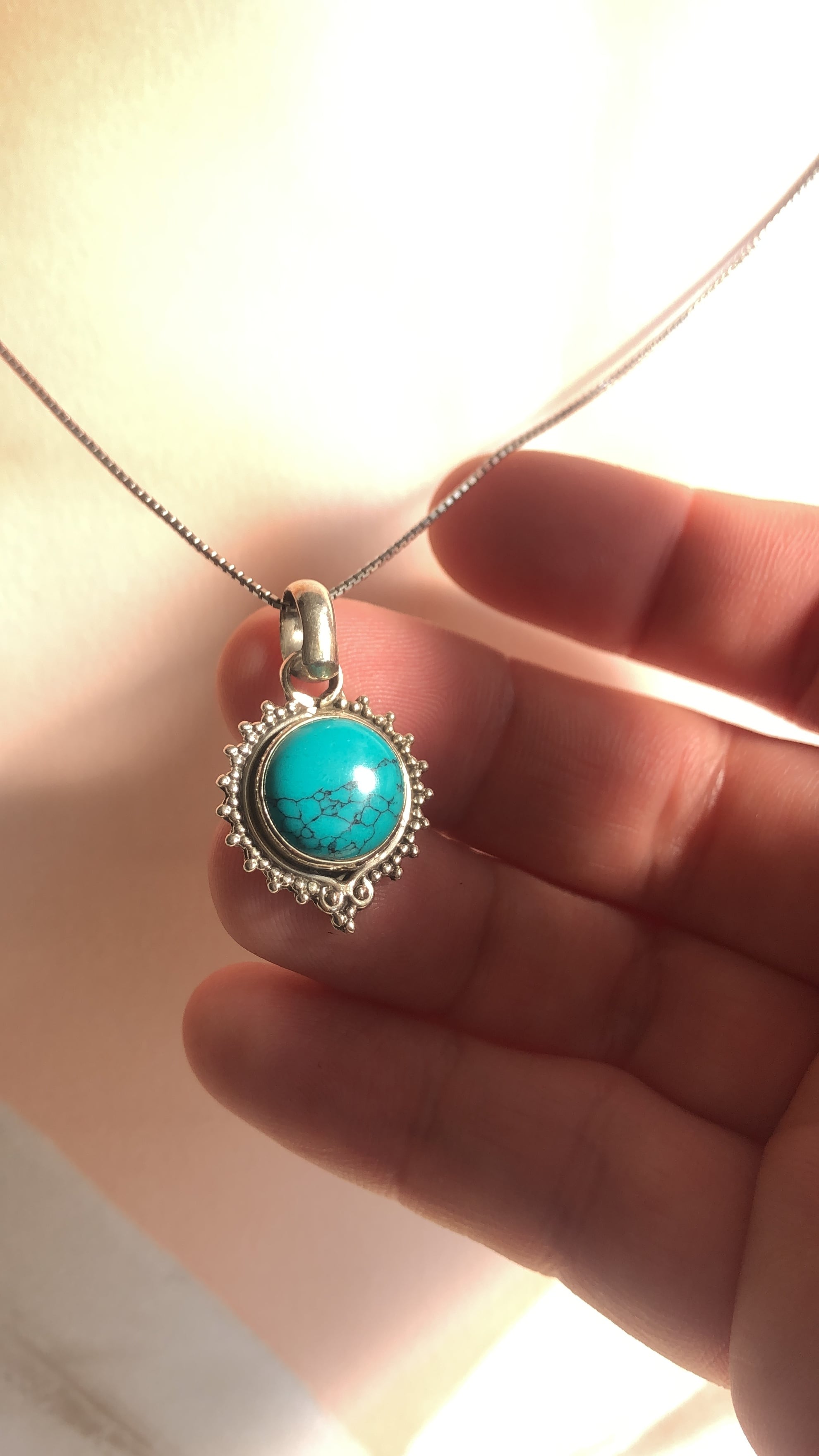 美しい発色のトルコ石とシルバーの装飾で太陽のようなペンダントトップ。