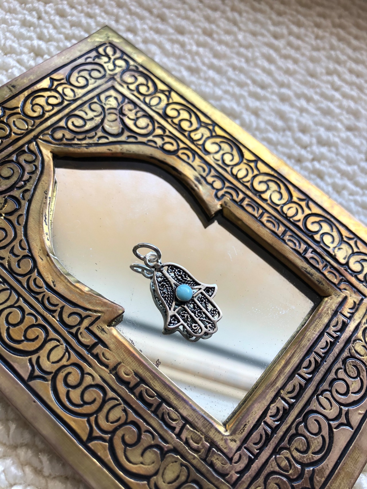 魔除けとして人気のあるハムサ/ファティマの手のペンダントトップ。透かしが可愛いモダンデザインのハムサです。